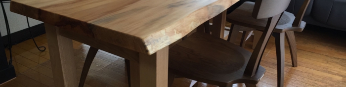 ダイニングにトチ一枚板と、しつらい・アッシュM色x4脚をお届けさせていただきました。