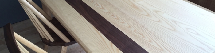 テーブルはアッシュxウォールナットのストライプ、この向きを変えるだけでも気分転換ができます。この組み合わせのほかにウォールナットのストライプ幅が広く、中央に配されたデザインもございます。