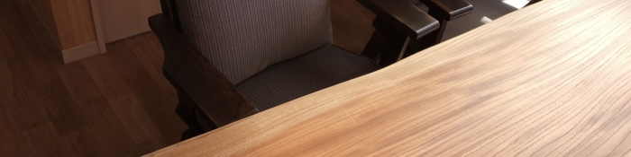 今回のケヤキ一枚板はすっきり目の木目ですが、その形と耳なりがワイルドですっきりしながらケヤキ独特の色合いと風合いがお楽しみいただけます。脚が少し濃いめのお色なので、一枚板の雰囲気が一層お楽しみいただけます。
