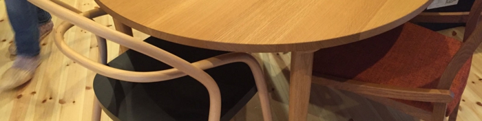 イスも4脚同じか、1脚ずつ変えるか様々お試しいただいた結果、ナガノインテリアのスタックングの出来るチェアと、TONのビーチベントウッドチェア2脚ずつをお選びいただきました。TONのチェアのシートハイが少し高かったため、シートハイが合うように脚カットを行いました。するとアーム部がちょうどテーブル下に入るようになりました。
