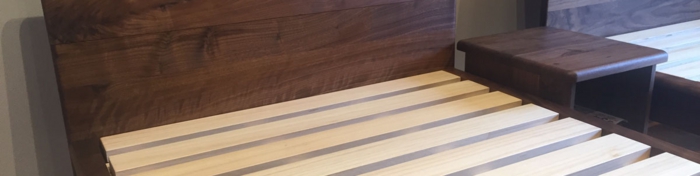背面も綺麗な無垢のベッドフレームという事で、こちらのクチュールをお選びいただきました。材はナラ・ウォールナットの2種類からお選びいただけます。お色はどちらもナチュラル色、座面高が15cm~40cmまでの間で5cm刻みでお選びいただけます。ナイトテーブルは同じ常盤家具の別シリーズ・ヨーデルのナイトテーブルです。材質は同じウォールナットで、総無垢で出来ております。こちらはアイデア次第で玄関のスツールにしても便利です。常盤家具製作所の製品は、木部の保証10年付きです。