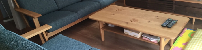 テーブルの大きさが通常よくあるサイズよりももう少し奥行きが欲しい、少し棚が欲しいという事で、飛騨産業のスタンダードコレクションのリビングテーブルをご提案させていただきました。併せて、ナラ・ビーチ・ウォールナット・コンビからお選びいただけるオーダーテーブルもご提案させていただきましたが、既製のサイズをお選びいただきました。