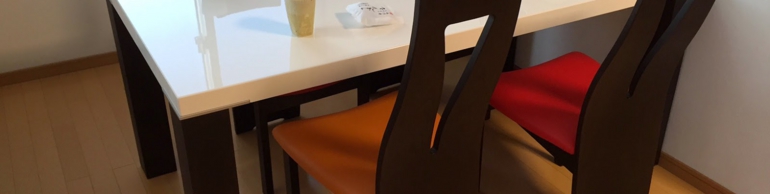 椅子はハイバックデザイン。成形合板で背当りも非常によく、座面はゆったり幅広で低反発ウレタンでやさしく加重を受けます。奥様とお兄ちゃんの好みで座の色をレッドとオレンジの2色で張りました。いい感じになってよかったです。
