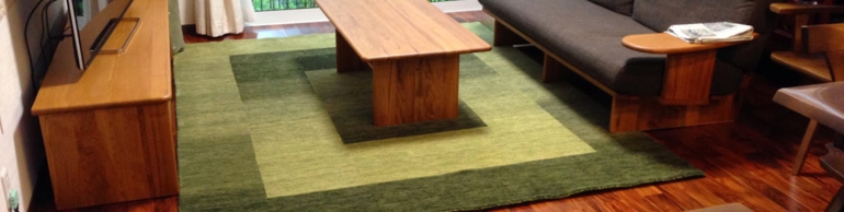 インドギャッベと相性抜群です。栗無垢のボリュームある素材をやさしい面取りで仕上げてありウォールナットともしっくりきています。