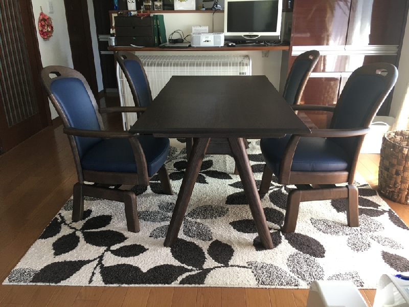 広島の浜本工芸のNo.3800です。長時間座っても疲れにくい秘密は、ソファの作り方を取り入れた構造です。テーブル高は64cmのLD高をお選びいただき、それに合わせてチェアもLD高に合せました。1脚、奥様のチェアだけは体型に合わせて当店にて1cm脚カットさせていただきました。