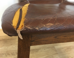 Y様20年以上お使いのダイニングの修理のご相談を頂きました。良質なナラ材でできた、オランダ製のチェアです。 座面は張地の皮革がやぶれており、木部はその重量で座と背の接合部がぐらついていました。 座面は同じく本革で張り替えました。木部はグラツキのある個所を組み直し+補強をしました。 Y様この度は誠にありがとうございました。