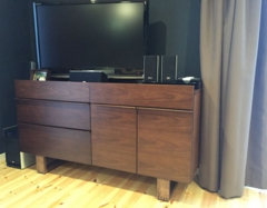 カップボードは奥様が即決でお選びになった、作りも質感も良いボードです。横から見てもとてもきれいです。BIS サイドボードは、当初サイドボードとしてお考えでしたが、納品の際にTVボードとして使えるように配置させていただきました。天板部分が引出しの前板で少し隠れるようになっています。脚の存在感も特徴ですね。