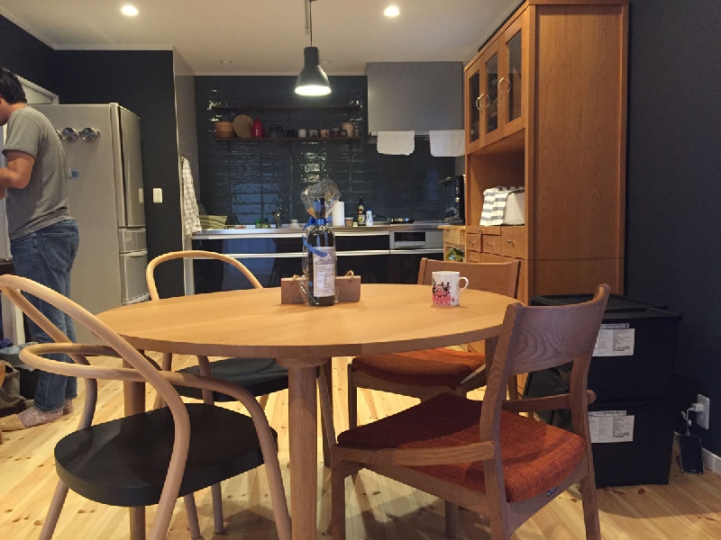 キッチンからダイニングスペースの動きやすさ、使いやすさ、落ち着ける空間をとても大切にされていて、当初ダイニングテーブルは長方天板の予定でしたが、奥様のご希望で丸テーブルにお決めいただきました。L字型のLDKで、曲がり角~キッチン側にダイニングテーブルを配置する予定でしたので、今回のM様の邸宅の場合、丸テーブルが一番省スペースで使いやすい形になりました。