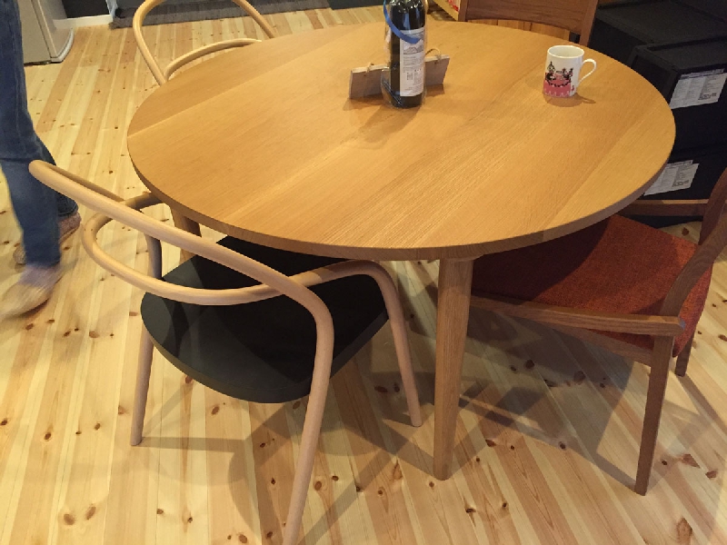 イスも4脚同じか、1脚ずつ変えるか様々お試しいただいた結果、ナガノインテリアのスタックングの出来るチェアと、TONのビーチベントウッドチェア2脚ずつをお選びいただきました。TONのチェアのシートハイが少し高かったため、シートハイが合うように脚カットを行いました。するとアーム部がちょうどテーブル下に入るようになりました。
