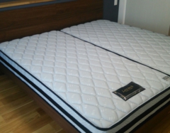 ベッドはフランスベッドのベッドフレーム:フラットヘッドボードにレッグタイプのメモリーナ65ウォールナット色に、アンネルベッドのピアノ線ポケットコイルマットレス、Aスタイルシルバーです。Aスタイルシルバーは、ピアノ線5.5インチクラスのマットレスで、両端と腰部を太くしてかたさを変えてあります。かたさはソフト・ハードの2種類よりお選びいただくことができる、内容勝負のマットレスです。