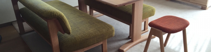 ダイニングソファはロータイプですが、深い座面と背もたれの上部がロールした構造になっているため独特の快適な掛け心地です。