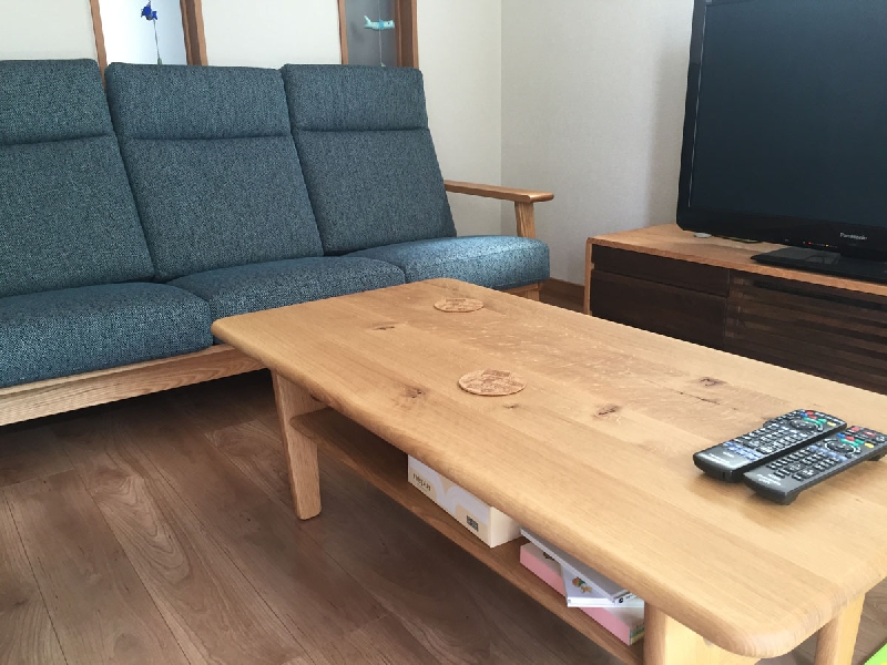 テーブルの大きさが通常よくあるサイズよりももう少し奥行きが欲しい、少し棚が欲しいという事で、飛騨産業のスタンダードコレクションのリビングテーブルをご提案させていただきました。併せて、ナラ・ビーチ・ウォールナット・コンビからお選びいただけるオーダーテーブルもご提案させていただきましたが、既製のサイズをお選びいただきました。
