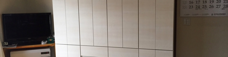 今回は隣の部屋との引戸扉の前に設置させていただきました。戸の高さが180cmで本体は奥行47cm・上置は奥行32cmで写真のとおりになりました。上置にはつっぱりがついていて転倒防止仕様になっています。幅240cm×高さ239cmの大収納家具です。お客様お使いの家具はダークブラウン色、床はナチュラル色でしたのでお部屋の色の調和も考えてスフレ色をおすすめさせていただきました。壁と同系色にしたので、すっきりまとまりました。取っ手がないので美しいです。