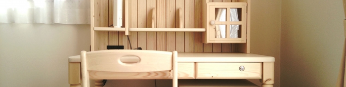 やさしい印象のパイン材ナチュラル色を基調に、デスク天板は下地の見える淡いホワイト色です。コンビカラーですが、コントラストが弱く、お子様にはもちろんですが、ご両親にも人気がございます。