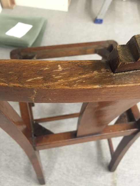 背もたれの木部割れは、接着+釘で固定釘穴と割れ面を埋めて違和感の無いよう色を合わせます。